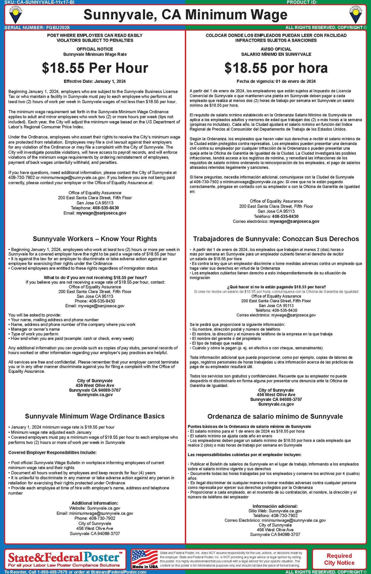Sunnyvale, California Minimum Wage Poster (Bilingual) — State and